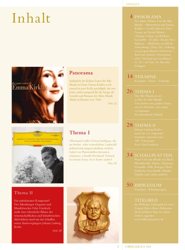 In dieser 250. Ausgabe unseres Magazins ist viel von Jubiläumsanlässen die Rede. Da ist zunächst der 300. Geburtstag von Johann Ludwig Krebs, dessen Altenburger Amtsnachfolger Felix Friedrich im Vorfeld der anstehenden Krebs-Würdigungen ein erfreuliches Fazit des aktuellen Forschungsstandes zieht, mag auch hinsichtlich des Kantatenschaffens noch eine Menge Arbeit warten. Als eine vorläufige Bilanz liest sich auch der Essay von Bernhard Trebuch über die ›wilden‹ Siebziger und ihre verwelkenden Ideale.